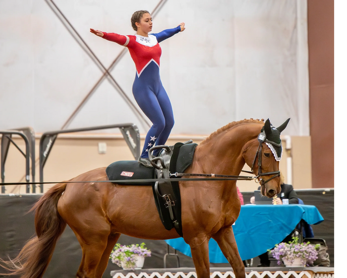 Nicolette is currently in college seeking a degree in geology. Nicolette has been vaulting since she was 5 years old. She is a 2* Silver level vaulter competing nationally and internationally. She has been on many Nationals champion teams through the years including alternate for 2021 Jr. World team. She is very good with the physics and mechanics of vaulting, as well as performance and the theatrical side of vaulting. Nicolette coaches the mid to upper level vaulters and also helps ride the horses to keep them fit.